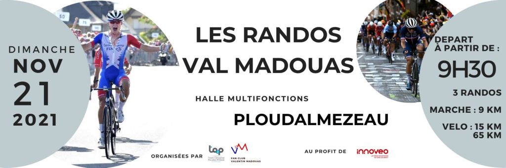 Avec le soutien de la commune de Ploudalmézeau et de nombreux partenaires, le to2p, le Fan Club Valentin Madouas et innovéo (le fonds de dotation du CHU de Brest) coorganiseront la deuxième édition de La Val Madouas le dimanche 21 novembre prochain. Au programme, deux randos cyclo (15 et 65 km) et une rando marche (9 km). Le certificat médical n’est pas exigé mais le pass sanitaire sera obligatoire. Vous pouvez télécharger le règlement et le bulletin d’inscription puis les tracés GPS des parcours à partir de cette page. Inscriptions à la Halle Multifonctions (rue Dr Amédée le Meur) de Ploudalmézeau dès 8h45, premiers départs vers 9h30.