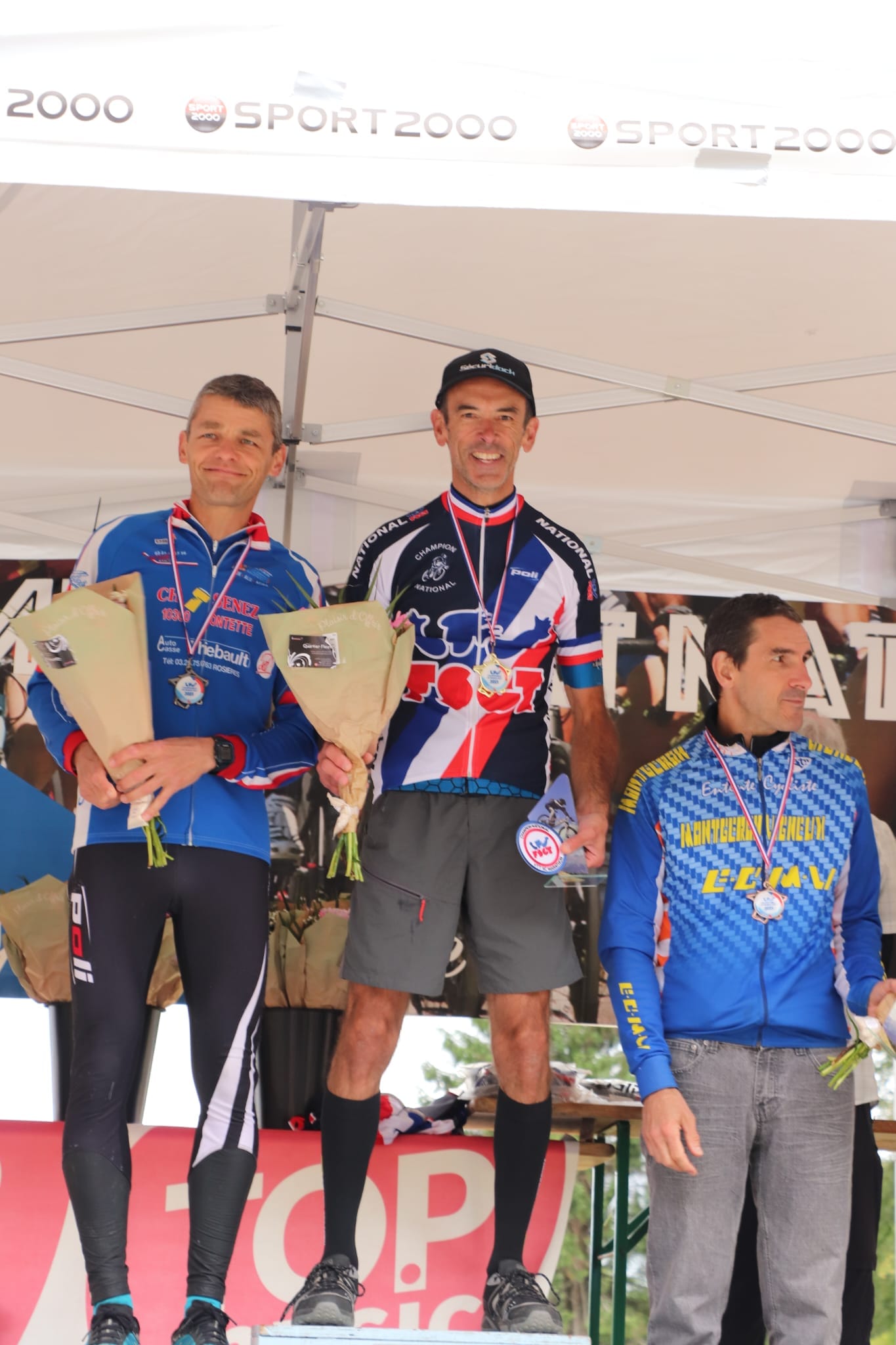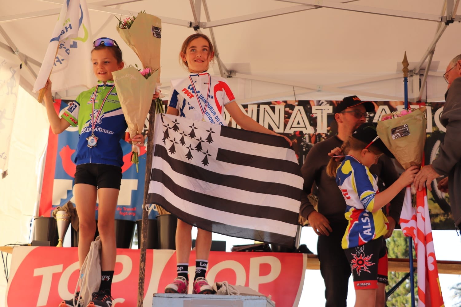 Le weekend du 1/2 juillet, une délégation du to2p – des compétiteurs et des supporteurs – a traversé la France afin de participer au Criterium National de VTT de la FSGT en Alsace. Elle revient avec 3 titres ! On peut se demander si la victoire de l’ami Valentin MADOUAS sur route chez les pros le week-end dernier les a motivés…! Bravo à Lina LE HIR en moustique, Maely LE HIR en pupille, et Zavier LE BEC en masters (l’épreuve XC marathon) ! Nos autres participants ont été « dans le match » également : Azilys en poussine, Léa en pupille, Axelle, Agathe, Léna , Elouan et Melvin en benjamin(e), Alexa en minime, Lucas et Gaëtan en cadet, Yann et Cédric en senior, Xavier en vétéran, Hélène (3e marche du podium vétérane !), et Patrice en master. C’est sûr, la délégation a vécu des moments de dépassement, d’encouragement et de cohésion.