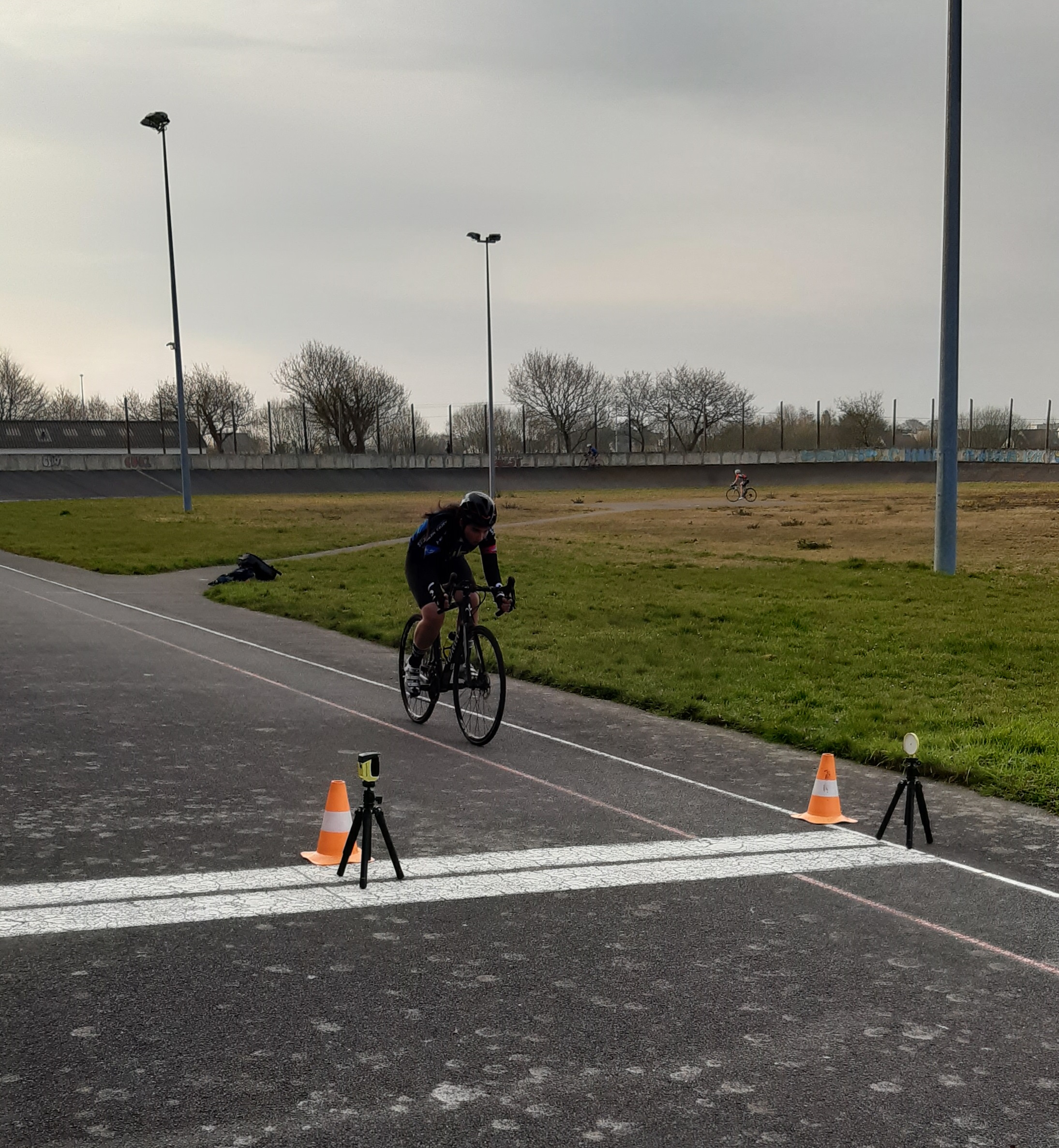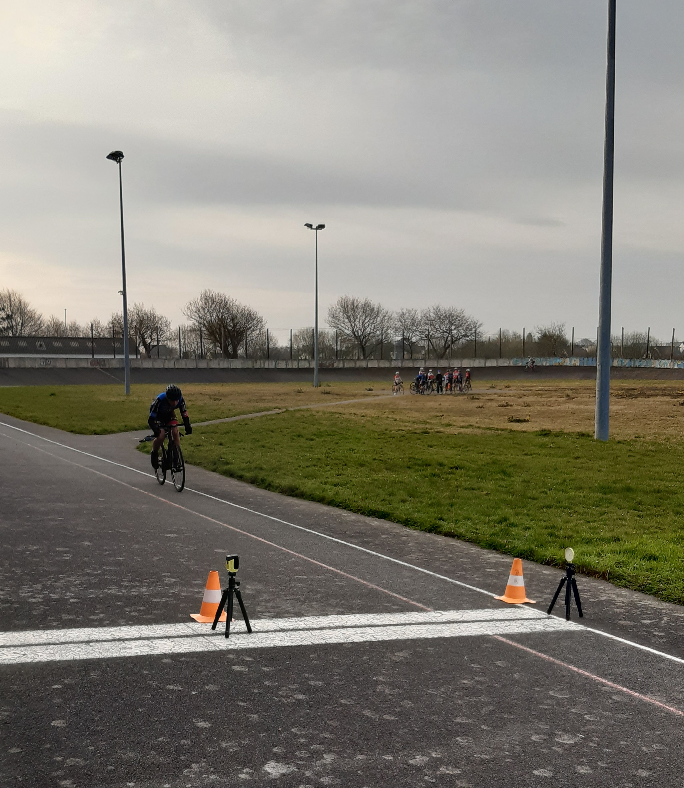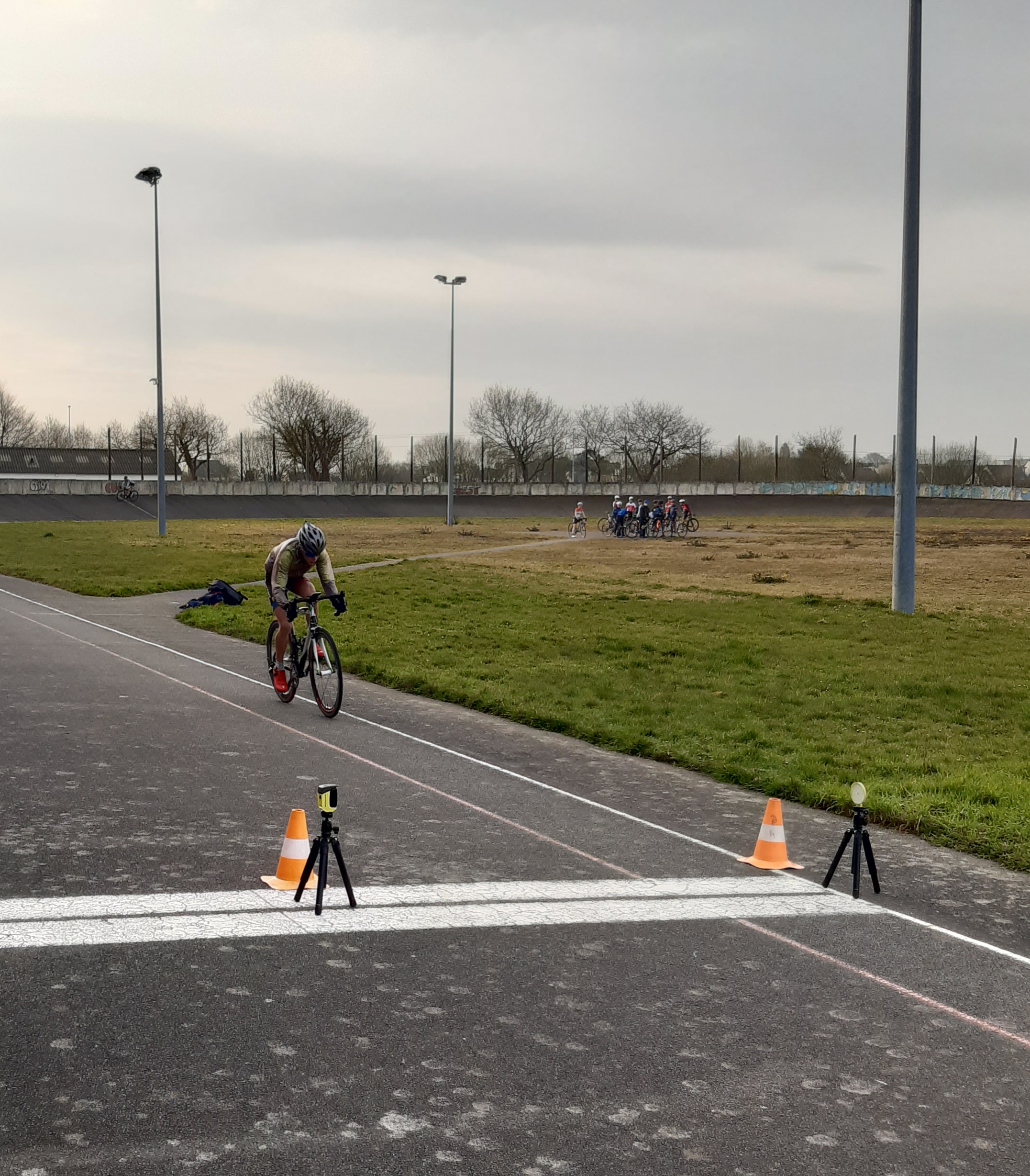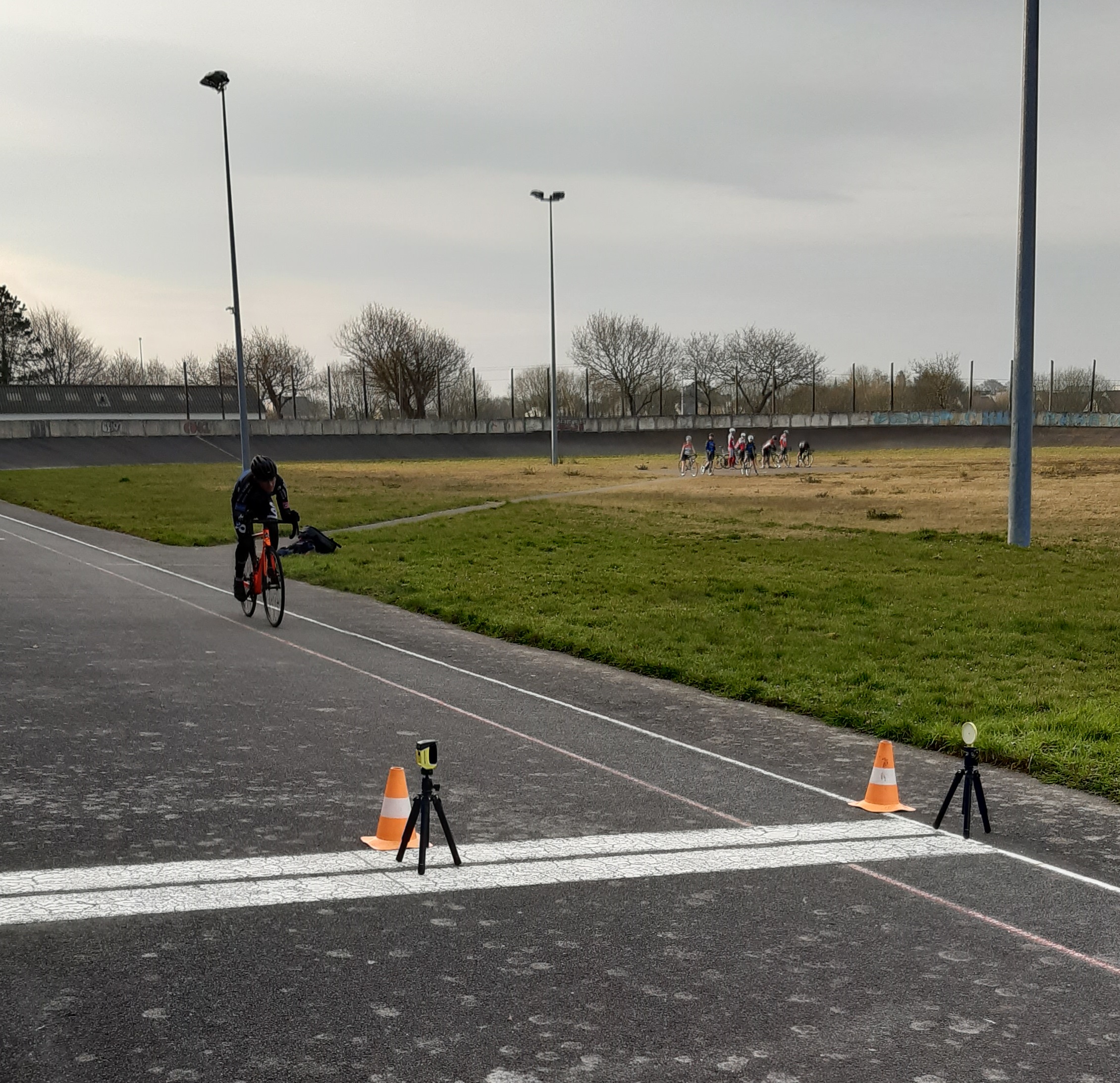 Encadré par Hervé, Jean Philippe et David, six de nos cadet(te)s – Benjamin, Enzo, Maxence, Manon, Roman et Téa (Quentin et Emma sont en vacances) – ont participé ce matin aux tests de détection 15/16 ans organisés par le Comité Départemental de Cyclisme 29 au vélodrome de Guipavas, avec une quinzaine d’autres coureurs issus des clubs du département. De nouvelles expériences et un peu d’appréhension pour tous lors des trois épreuves : un 200 m départ lancé (vitesse), un 60 m départ arrêté sur le 50×14 (force) et, pour terminer, un 3000 m départ arrêté façon poursuite (endurance). Nos débutants sur piste ont tous ont pris du plaisir à fournir des efforts intenses sur l’anneau mais ils mesurent désormais le travail qu’attend les futurs pistards. David a pris ces quelques (mauvaises…!) photos.