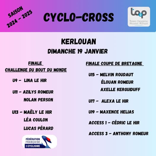 Le 23 novembre 2024, Team Oxygène de Ploudal Portsall organise le cyclo-cross des 3 Moutons au camping municipal de Lampaul-Ploudalmézeau. Ce cyclo-cross fait partie du tout nouveau challenge du bout du monde (Finistère Nord) et en est la 4ème manche. Spectacle garanti sur un site exceptionnel à 50 mètres de la plage des 3 Moutons. Départ des 1ères courses : 12h45. Restauration sur place, lavage, douches, parkings à proximité et aire de camping-car avec services à 2 minutes. Entrée gratuite pour les spectateurs. Vous pouvez télécharger le programme des courses. Merci à nos partenaires ! :