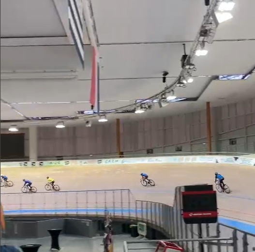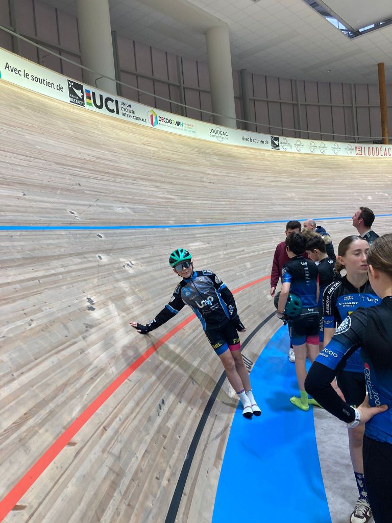 C’est la seule piste couverte de la région, inaugurée fin 2023. Certains sont partis de Ploudal tôt le matin (merci à notre sponsor le Garage Renault St Roch pour le prêt de son fourgon), tandis que les quelques camping-caristes ont passé la nuit précédente sur place. Notre créneau de deux heures sur la piste a commencé par l’obligatoire « baptême » en deux groupes, sous les ordres bienveillants et experts des encadrants Sezny et Quentin. Le baptême consiste à la prise de connaissance du vélo de piste « sans frein » – c’est-à-dire à pignon fixe – puis une montée progressive sur la piste – d’abord quelques tours sur la zone de sécurité, ensuite quelques tours sur la « côte d’azur » (oui, la partie bleue), puis des tours sur le « couloir des sprinteurs » (la première partie pentue, entre les lignes noires et rouges), jusqu’à la ligne des stayers (la ligne bleue). Certains se sont approchés même de la balustrade du haut.