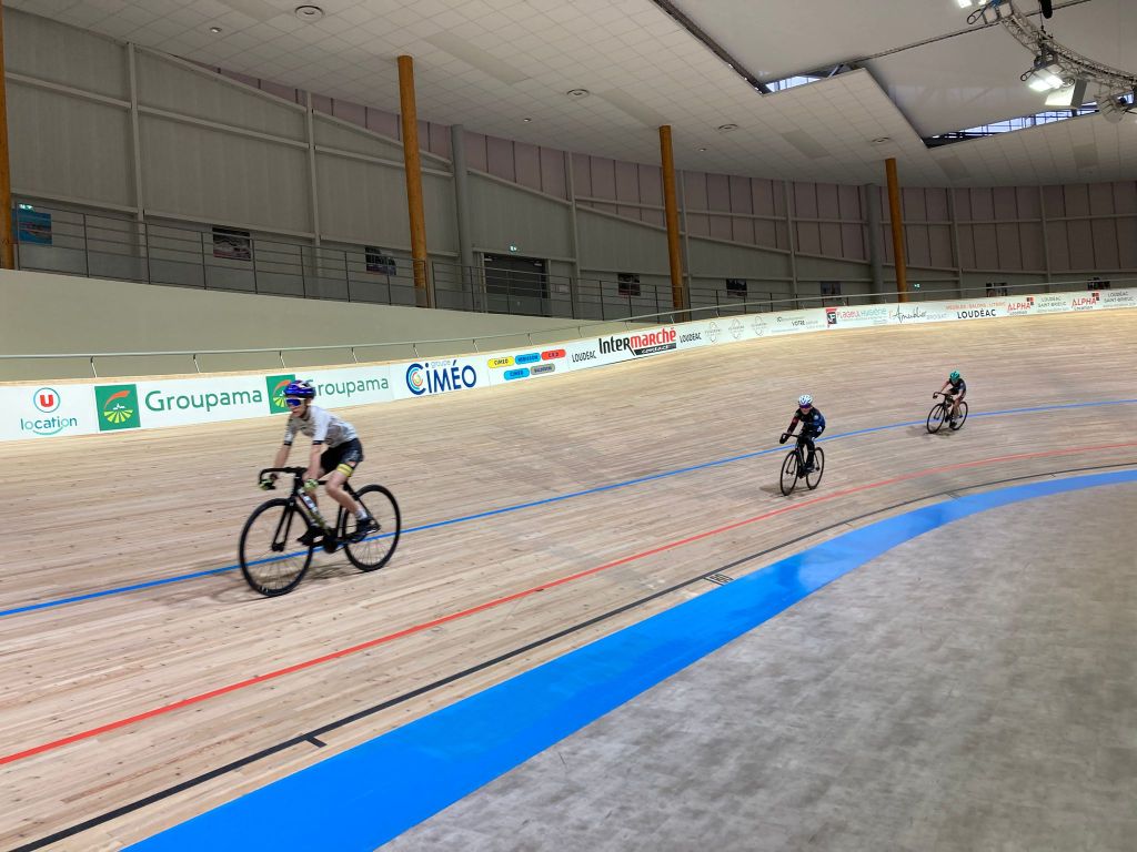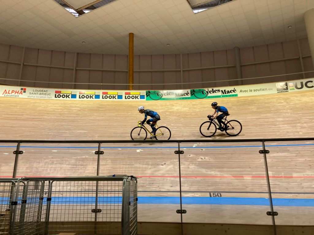 Tout cela en présence d’Hervé, le responsable de notre section piste, qui a passé une matinée studieuse en scrutant les coups de pédale des uns et des autres et en prodiguant des conseils avisés. Pendant la deuxième heure, Sezny et Quentin nous ont proposé des exercices supplémentaires de changement d’hauteur sur la piste, puis une petite compétition de vitesse par équipe (de 3, départ arrêté) : le premier coureur (le démarreur) fait un tour à fond puis s’écarte, le deuxième coureur continue (à fond) pendant un tour avant de s’écarter pour laisser terminer (toujours à fond !) le troisième coureur. Peut-être verrons-nous quelques adhérents du club débuter à la piste de Plouzané cet été… ?
