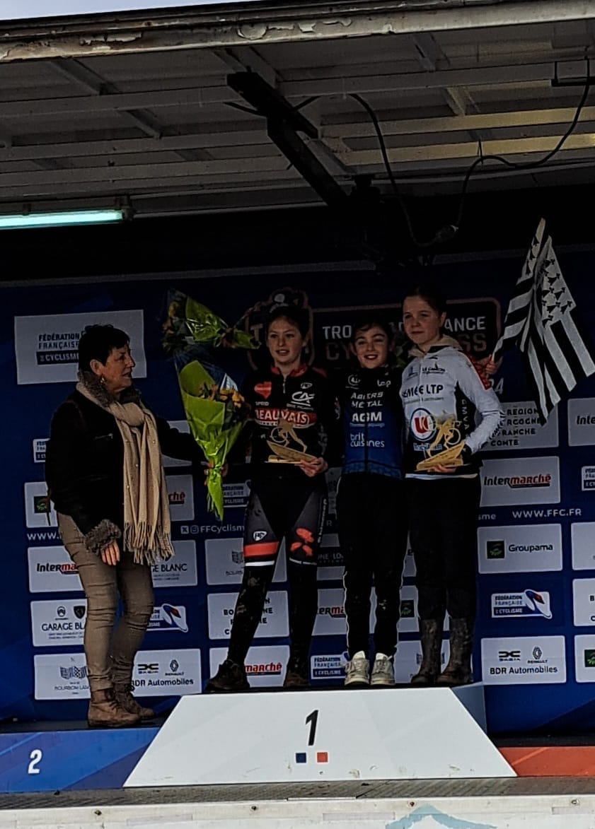 Valentin MADOUAS n’est plus le seul champion de France FFC parmi les adhérents du to2p ! Les 10 et 11 février, au Trophée de France de Cyclo-Cross (à Bourbon-Lancy en Bourgogne Franche-Comté), Maely LE HIR a remporté le cyclo-cross « eliminator » du samedi puis la course classique du dimanche en catégorie U13F. Selon le règlement, ce « trophée » n’est pas strictement un championnat national, mais dans les faits… Bravo à Maely ! . Notons aussi qu’en U15F, Alexa LE HIR se place 18ème le samedi et 20ème le dimanche. Enfin, la Bretagne termine 2ème au classement par équipe.